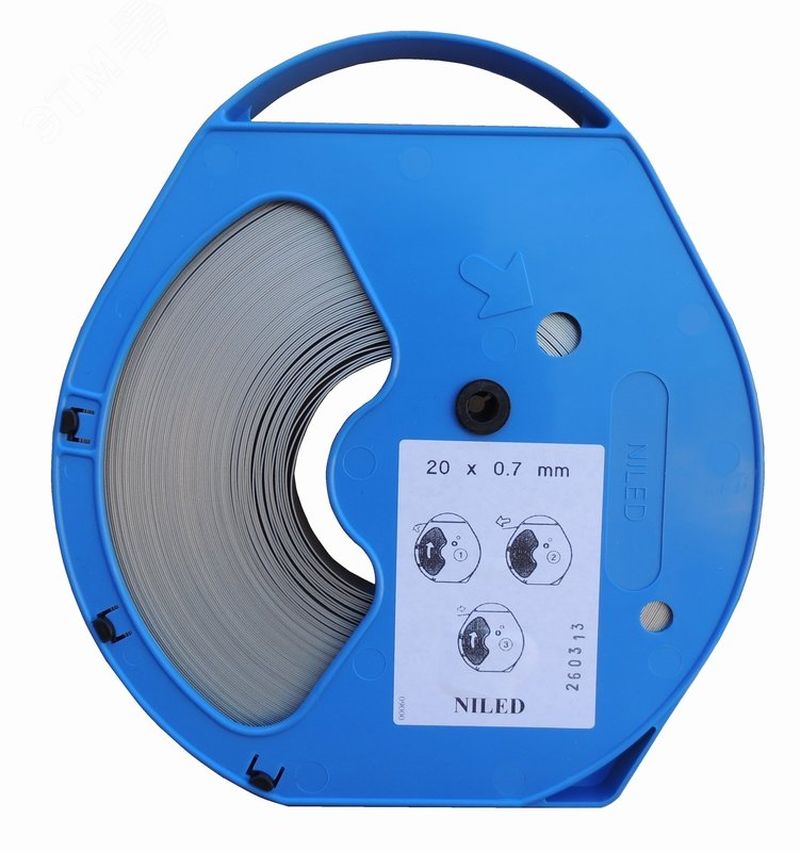 Изготовлена из нержавеющей стали. Имеет обработанную кромку. Обладает повышенной гибкостью, что значительно облегчает фиксацию ленты на опоре при помощи скрепы. Поставка в пластмассовой кассете по 50 м. На металлической ленте по всей длине нанесена маркировка производителя.