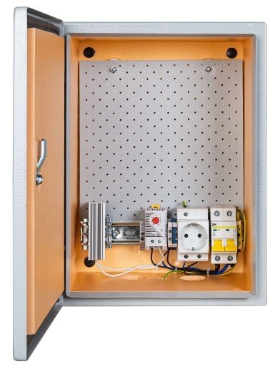 Термошкаф оснащен системой автоматического поддержания заданной температуры и относительной влажности, обеспечивающей безопасную работу размещенного в нем оборудования при температуре окружающего воздуха от -55°С до +50°С со степенью защиты IP66.